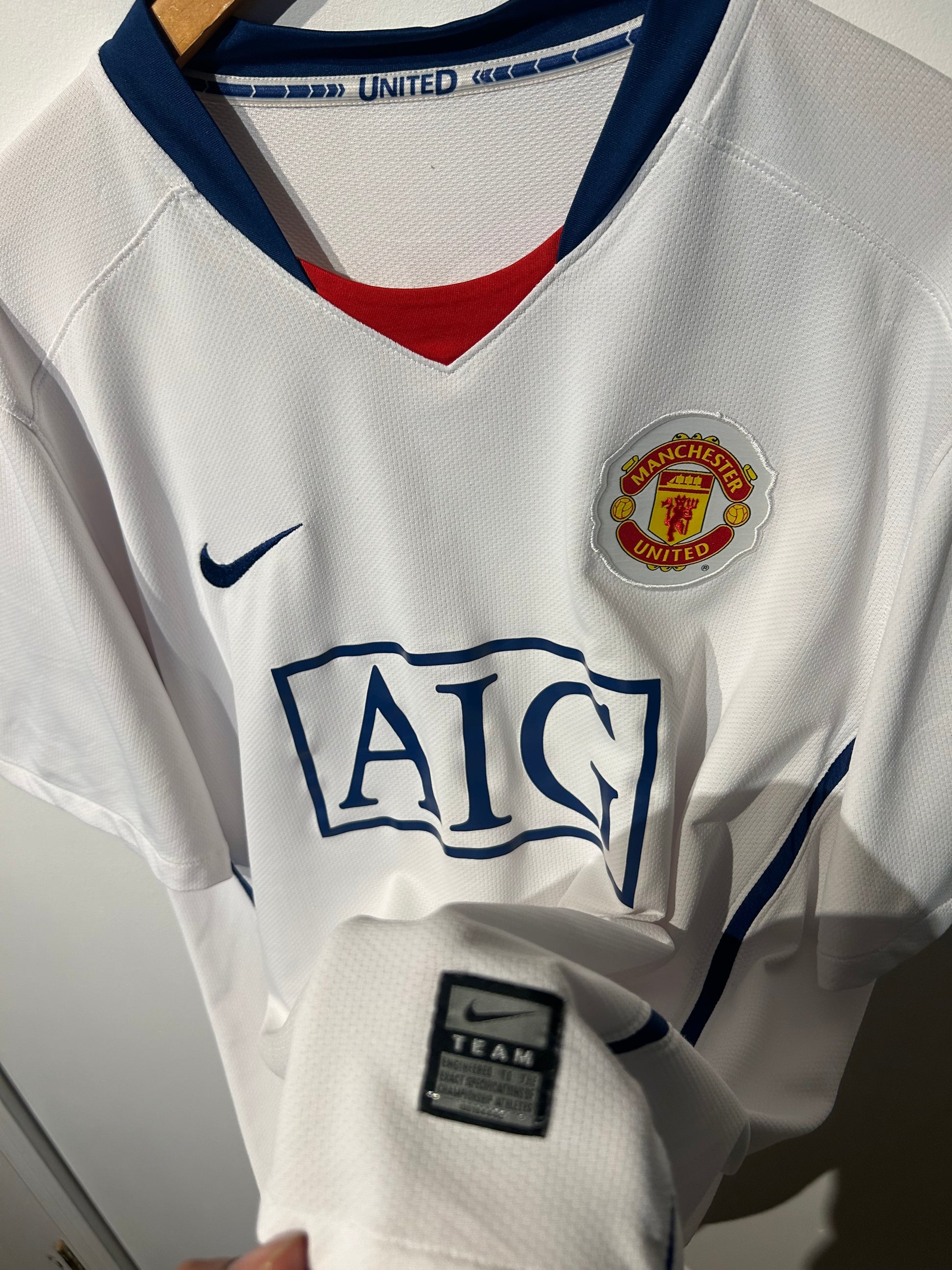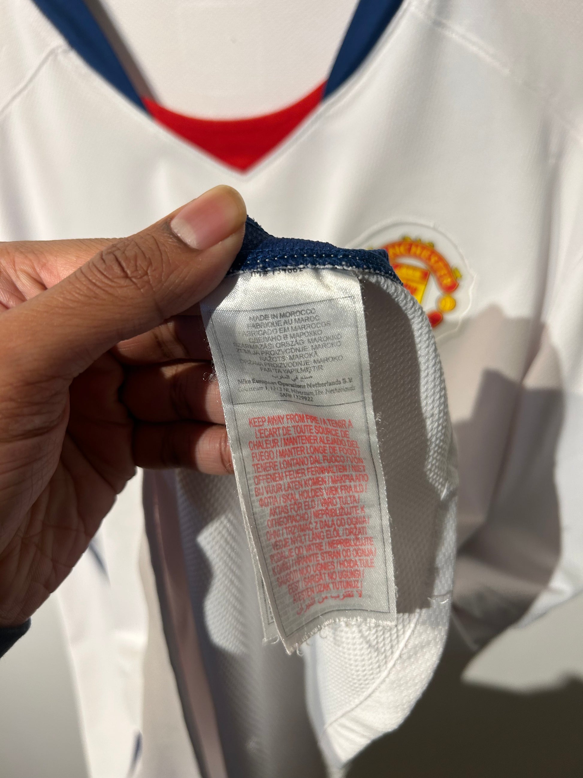 Defects: Minor pulls across the shirt, barely noticeable. Inner size details have faded. 'MUFC' writing on back top collar is slightly fading.